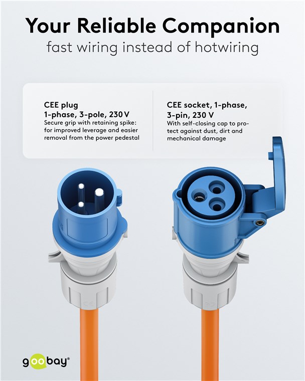 Die praktische Lösung für Camping und Außeneinsätze: Das CEE-Kabel verlängert schnell und einfach vorhandene Stromkabel – als zuverlässiger Stromgarant für alle elektrischen Funktionen im Wohnmobil, Caravan oder auch auf Baustellen. Sicher angeschlossen ans 230-V-Netz auf dem Campingplatz, wird jede Outdoor-Tour zum entspannten Energie-Erlebnis. Volle Power, voller Komfort.