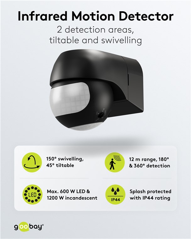 Wind und Wetter? Kein Problem, der Bewegungsmelder ist mit IP44 perfekt für Außenbereiche wie Garten, Carport oder Hauseingänge. Die 2 Infrarot-Sensoren reagieren auf Bewegungen aus horizontaler Richtung und aus dem Bereich unterhalb des Gerätes, daher ist der Bewegungsmelder besonders praktisch für eine erhöhte Installation. Bewegungsmelder von Goobay – mit Sicherheit ein gutes Gefühl.