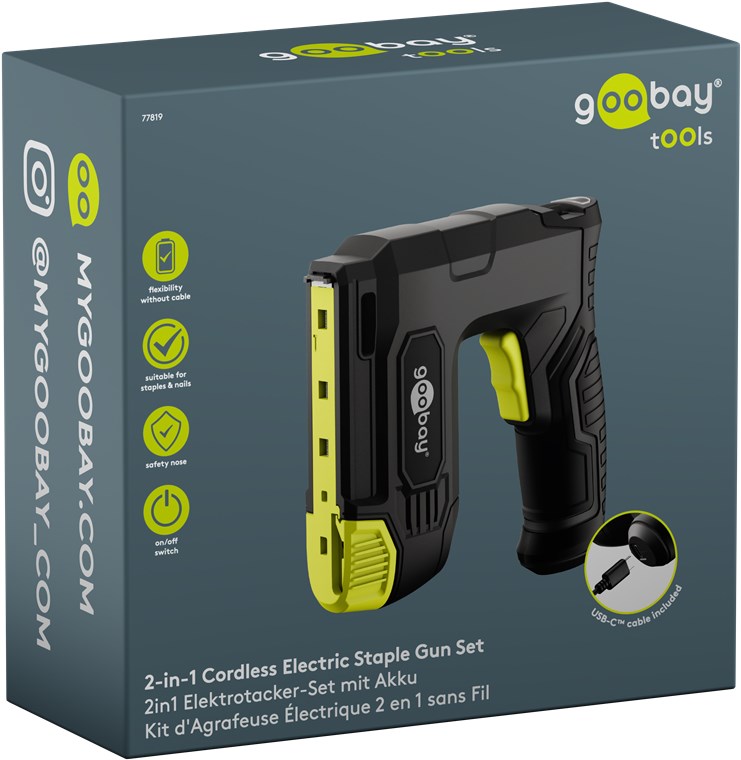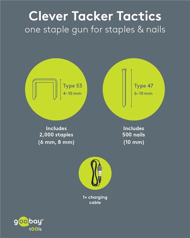 1000 Tackernadeln (6 mm), 1000 Tackernadeln (8 mm), 500 Nägel (10 mm), Ladekabel USB-A auf USB-C™