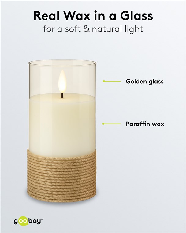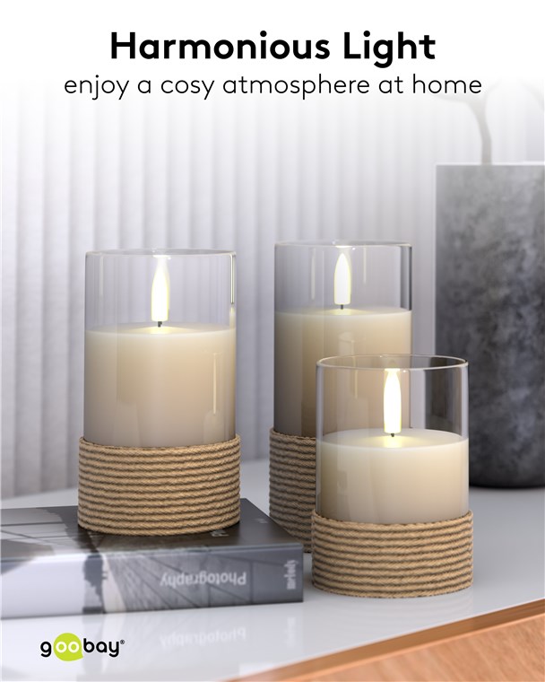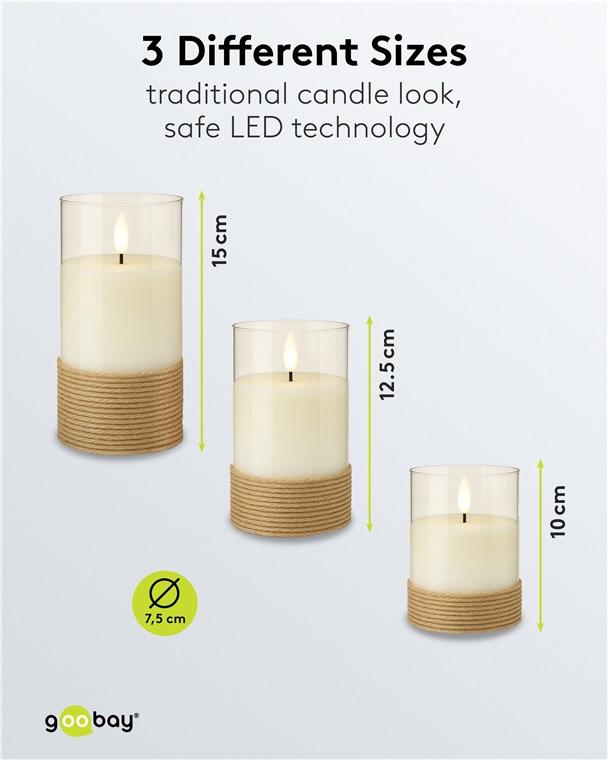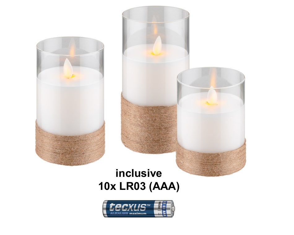 3er-Set LED-Echtwachs-Kerzen im Glas, weiß, mit Hanf umwickelt, inkl. 10x AAA (LR03)