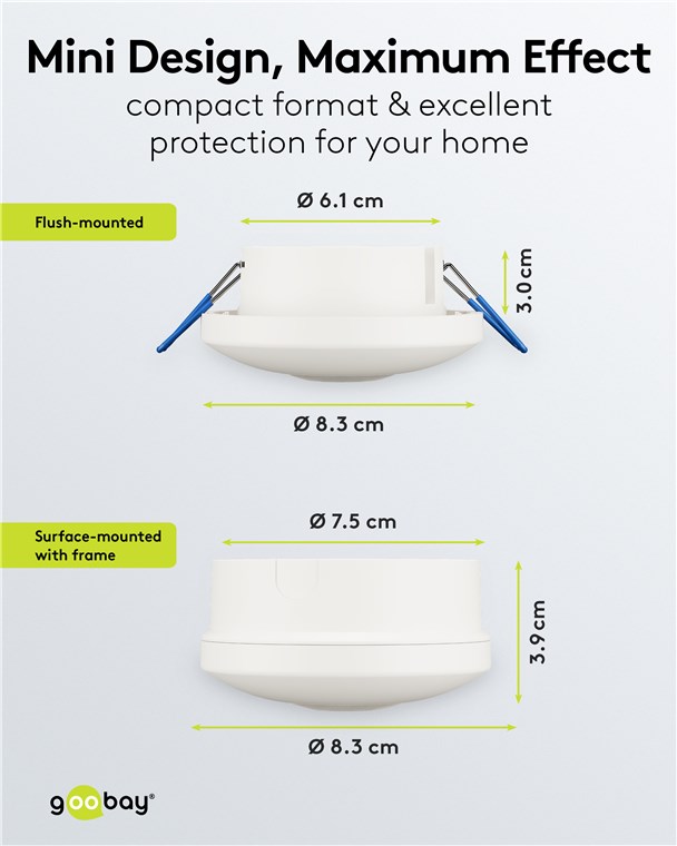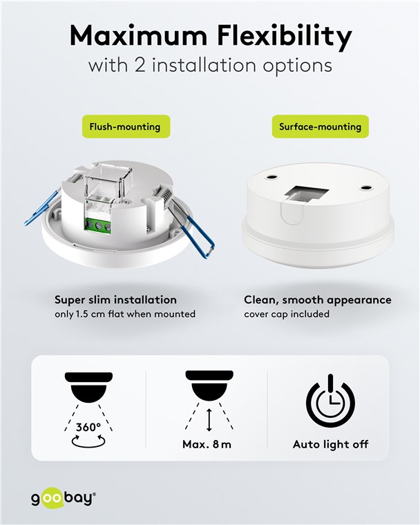Flexibilität ist King: Der Bewegungsmelder verfügt über zwei Klammern zur sicheren Unterputzmontage. Bei Bedarf lassen sich die Klammern entfernen, um den Bewegungsmelder mit dem mitgelieferten Baldachin zu einer Aufputzvariante umzurüsten. Mit beiden Installationsoptionen perfekt für Korridor, Bad oder Hausflur – der Bewegungsmelder aktiviert immer zuverlässig die angeschlossene Beleuchtung.