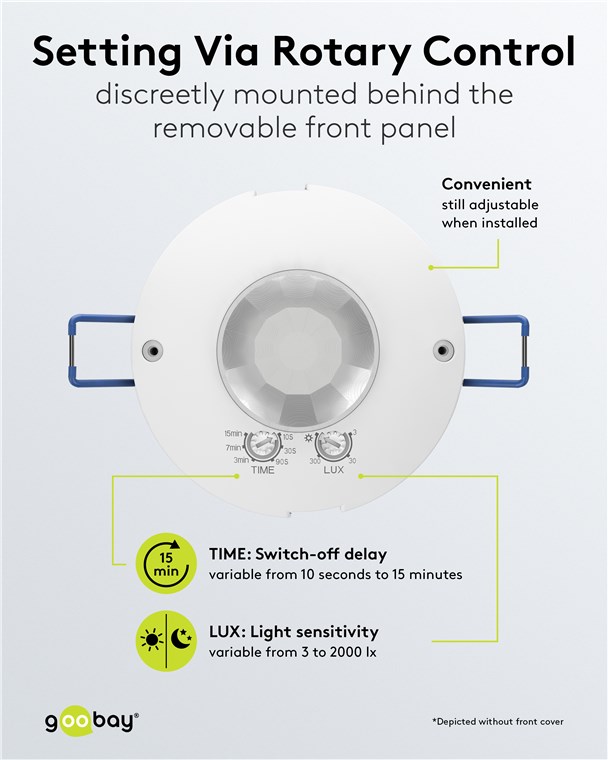 - Lichtempfindlichkeit (3 lx bis 2000 lx) und Abschaltverzögerung (10 s bis 15 min) lassen sich hinter der abnehmbaren Blende einfach und stufenlos per Drehregler einstellen