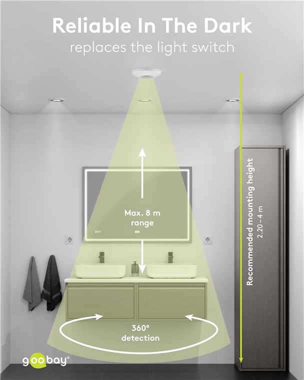 - Mit einem Erfassungswinkel von 360° ideal für die Unterputz-Deckenmontage, Installationshöhe: 2,20 m bis 4 m