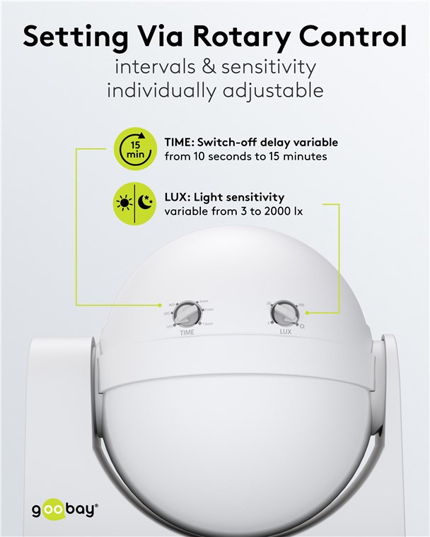 • Lichtempfindlichkeit (3 lx bis 2000 lx) und Abschaltverzögerung (10 s bis 15 min) lassen sich einfach und stufenlos per Drehregler auf der Unterseite einstellen