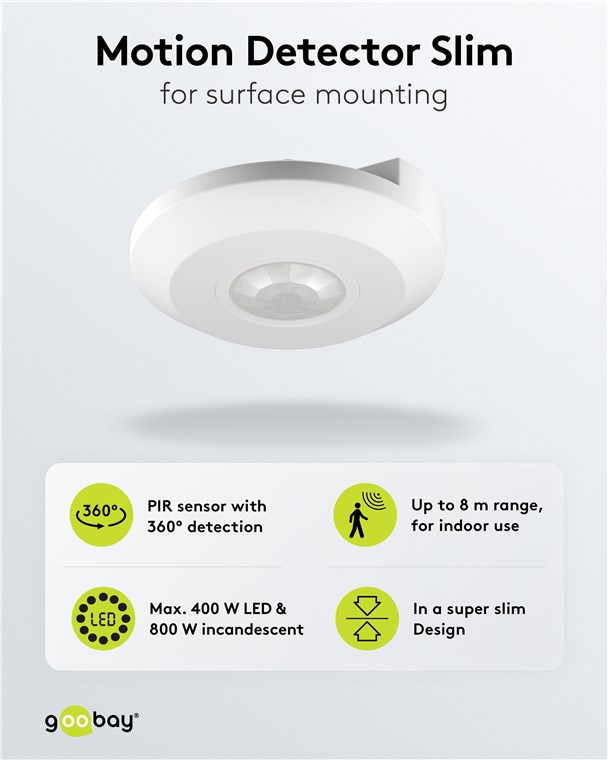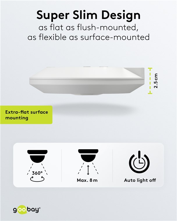Du möchtest eine Aufputzlösung, aber keinen Klotz an der Decke? Kein Problem, dieser Bewegungsmelder ist sensationelle 25 mm flach und damit optisch ganz dezent. Die Bedienung ist supereinfach: Die weiße Blende verdeckt die Drehregler, über die du Lichtempfindlichkeit und Abschaltverzögerung einstellen kannst – auch nach der Installation. Damit ist das Gerät deutlich komfortabler als Unterputzmodelle.