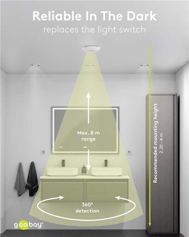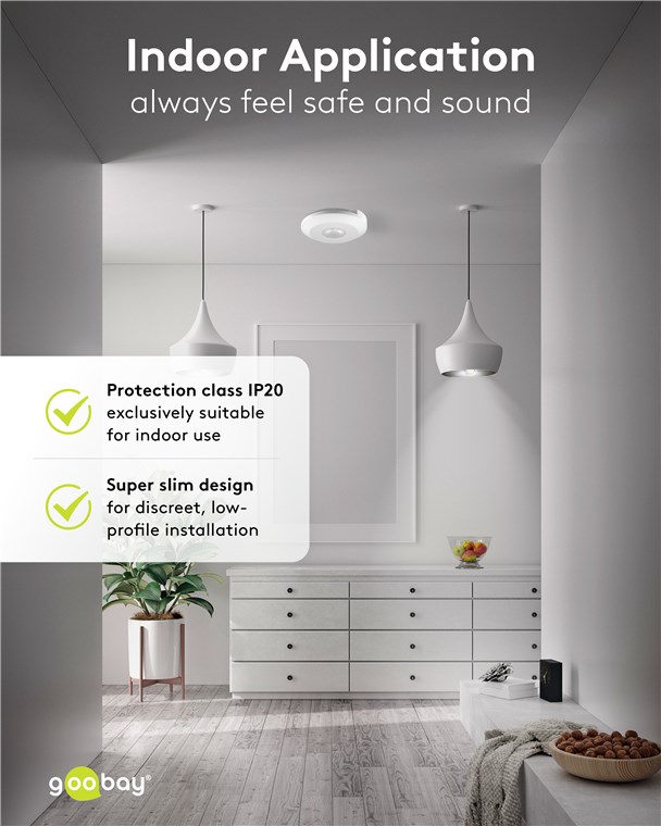 • Mit einem Erfassungswinkel von 360° ideal für die Aufputz-Deckenmontage, Installationshöhe: 2,20 m bis 4 m