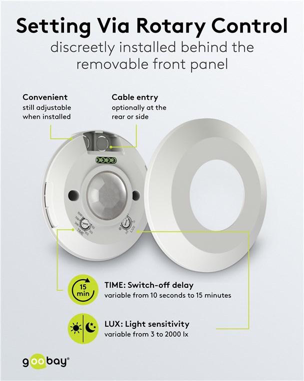 • Lichtempfindlichkeit (3 lx bis 2000 lx) und Abschaltverzögerung (10 s bis 15 min) lassen sich hinter der abnehmbaren Blende einfach und stufenlos per Drehregler einstellen
