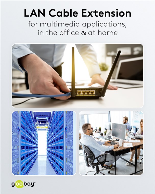 Unsere CAT-Kabel übertragen Signale in maximaler Qualität bei extremer Geschwindigkeit und sorgen für eine stabile Verbindung. Hochwertige Innenleiter, robuste Kabelummantelung und passgenaue Stecker zeichnen unsere Verbindungskabel und Stecker aus. Goobay hat immer das richtige Produkt für Ihre Netzwerkanwendung - sowohl für das Heim- als auch das Firmennetzwerk. Einfach. Alles. Passend!