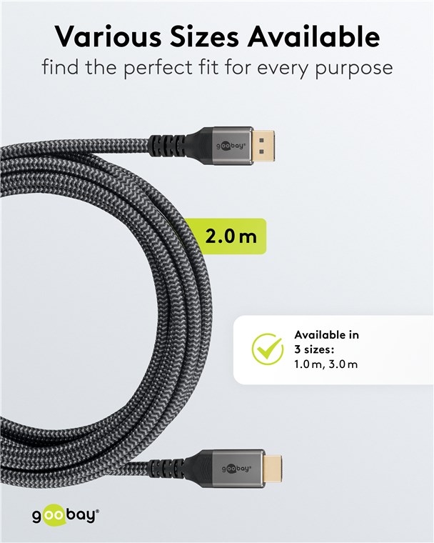 - Das Kabel erreicht mit DisplayPort™ 2.0/2.1 und HDMI™ Ultra HD-Auflösungen von bis zu 8K @ 50/60 Hz und eine Datentransferrate von max. 48 Gbit/s