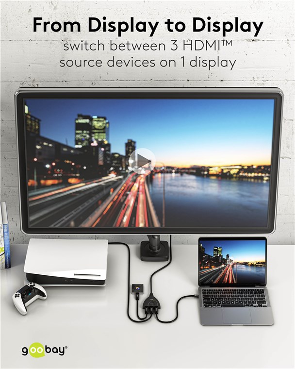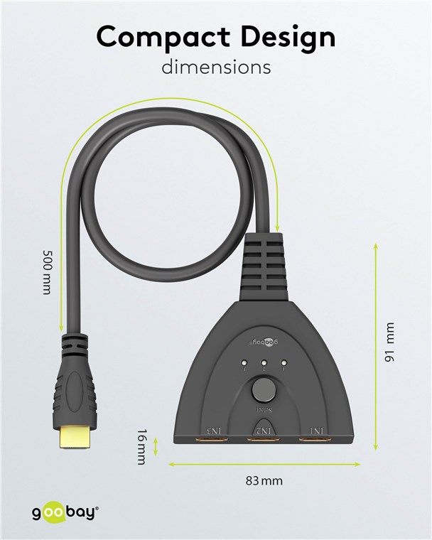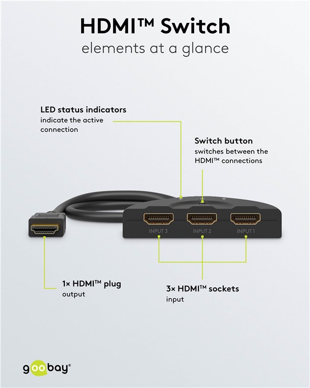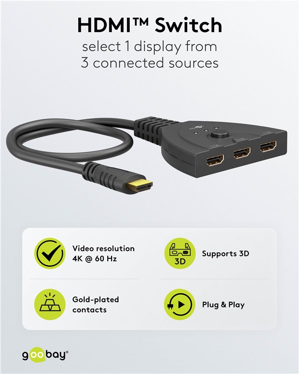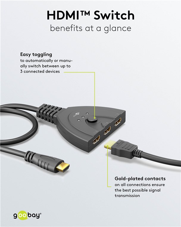 Der HDMI-Switch bietet den Komfort, per Knopfdruck zwischen 3x verschiedenen HDMI-Geräten zu wechseln, die an nur 1x HDMI-Display angeschlossen sind. Lästiges Umstecken der Kabel entfällt und schont die Anschlüsse. Durch seine kompakte Größe integriert sich der HDMI-Umschalter dezent in Ihre Wohnlandschaft.