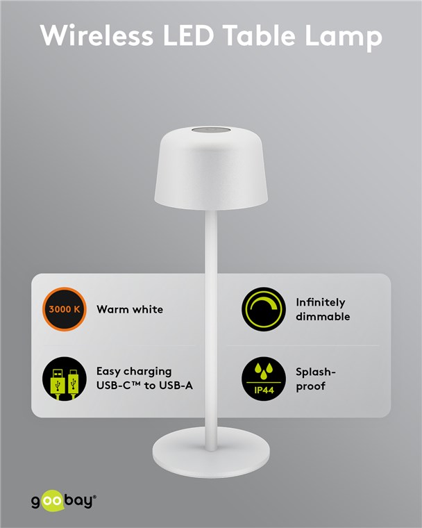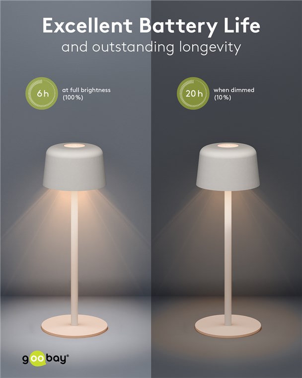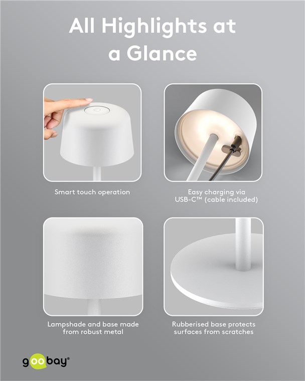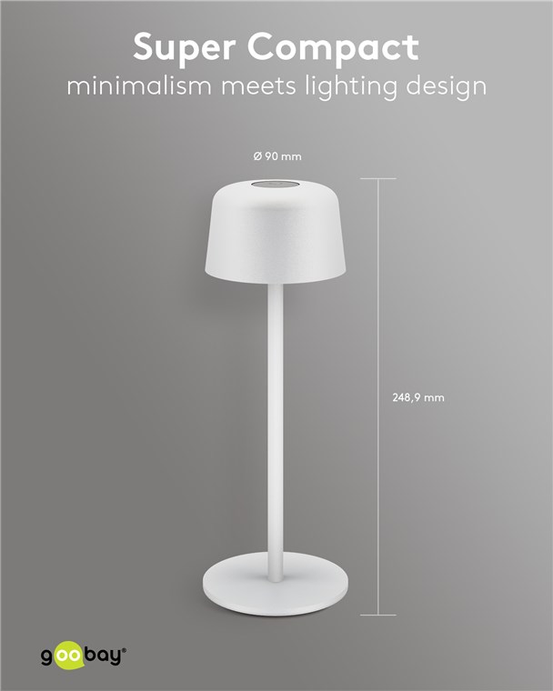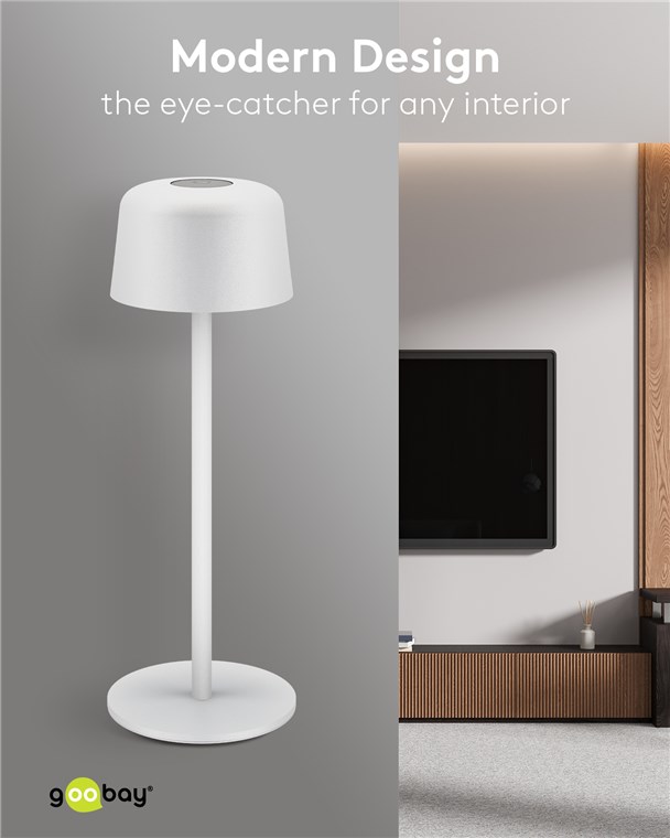 Die kleine Tischlampe veredelt mit ihrem reduzierten, skandinavischen Design jedes Wohnzimmer, Schlafzimmer oder Esszimer und setzt auch auf der Gartenparty ein Style-Statement. Gefertigt aus hochwertigem, massivem Metall, steht die innovative Goobay-Leuchte für Qualität und Langlebigkeit.