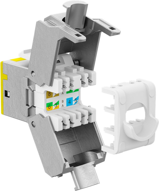 - Die feldkonfektionierbare RJ45-Buchse ist nur für Volldraht von 0,45–0,65 mm Durchmesser und nicht für Litzendraht geeignet