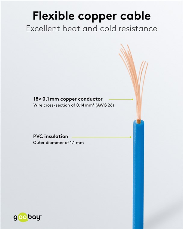• Unkonfektionierte Litze mit einem Aderquerschnitt von 0,14 mm² (AWG 26) und einem Außendurchmesser von 1,1 mm