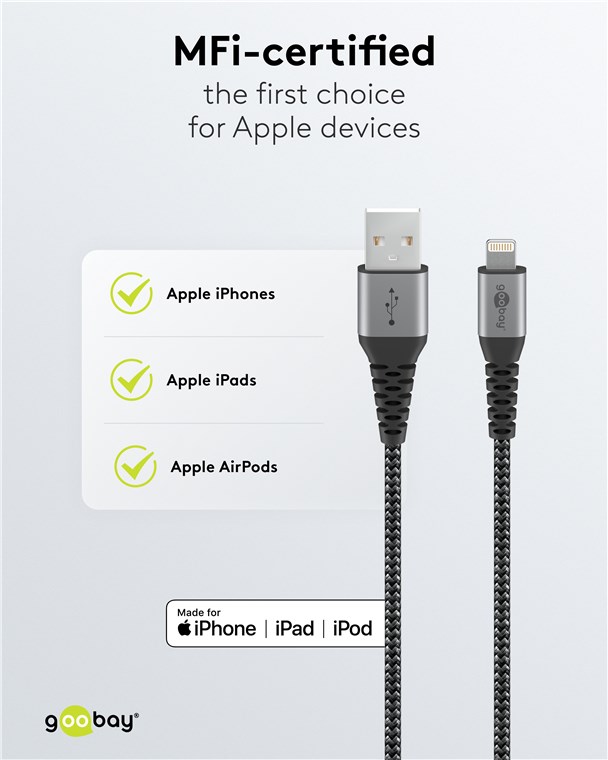 - Das Goobay Lightning-Ladekabel für superschnelles Laden und eine Hi-Speed-Datenübertragung bis 480 Mbit/s