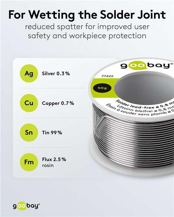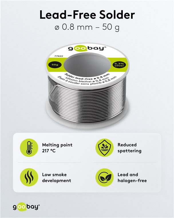 • Flussmittelgefüllter Lötdraht mit einem Durchmesser von 0,8 mm, ideal z. B. für das Löten von Elektronik