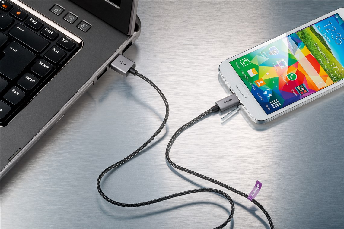 Dieses besonders flexible USB 2.0 Kabel mit Textilummantelung und Micro-USB Metallsteckern verbindet vielen gängige Tablets, Smartphones, Kameras und Hand-Held-Konsolen mit einem PC/MAC oder USB-Ladegerät. Das Kabel sorgt am Rechner für schnellen Datenaustausch mit bis zu 480 Mbit/s und lädt gleichzeitig den Akku. Die Länge von 0,30 Metern sorgt jederzeit für Ordnung und verheddert nicht.