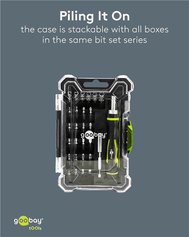 Jedes Bit ein Hit: Das Schraubenzieher-Set überzeugt mit seinen variablen Bits, dem Steckschlüsselsatz, einem ergonomischen, magnetischen Bithalter und der handlichen Transportbox. Durch die spezielle Form mit gummierten Ecken und einem robusten Verschluss ist die Box besonders widerstandsfähig. Der Clou: Die Boxen der Produktserie sind übereinander stapelbar. Cleveres Design, sicherer Transport.