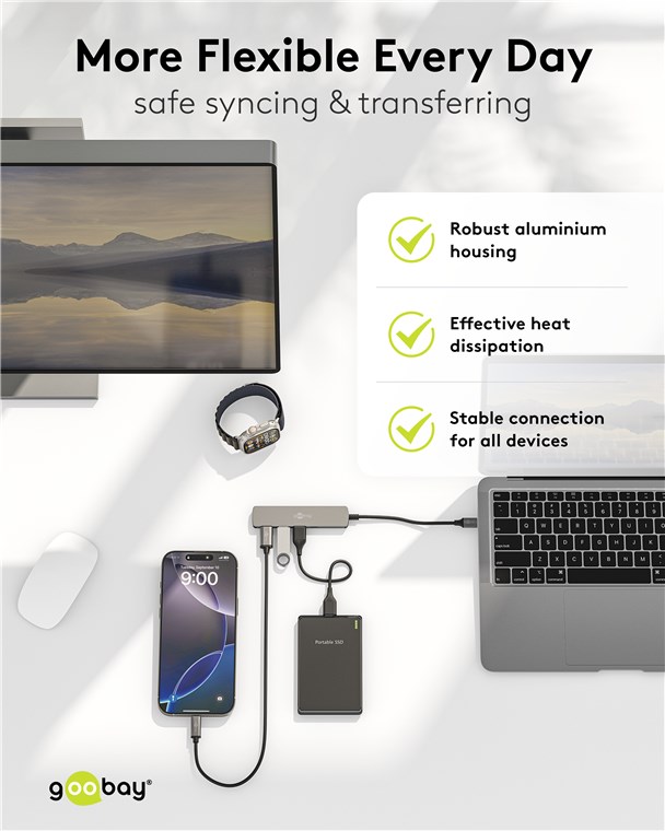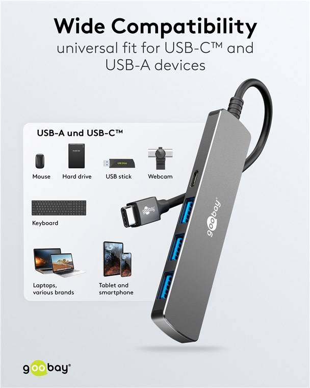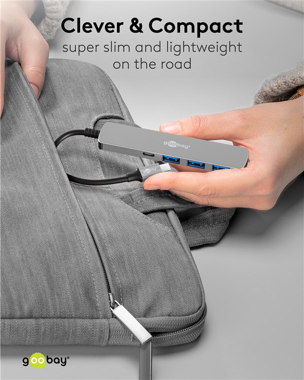 - Im kompakten Slim-Format passt der USB-C™-Hub in jede Tasche und wird unterwegs oder auf Reisen zum praktischen Begleiter