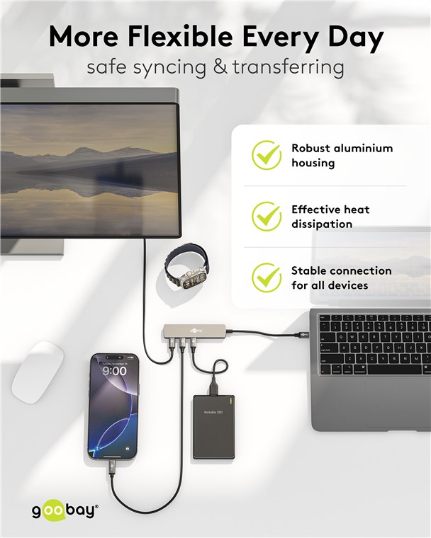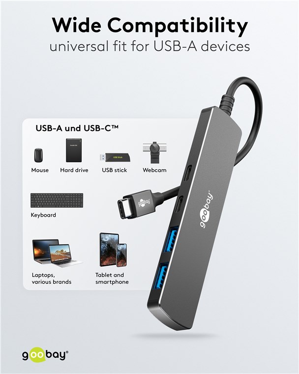 • Im kompakten Slim-Format passt der USB-C™-Hub in jede Tasche und wird unterwegs oder auf Reisen zum praktischen Begleiter