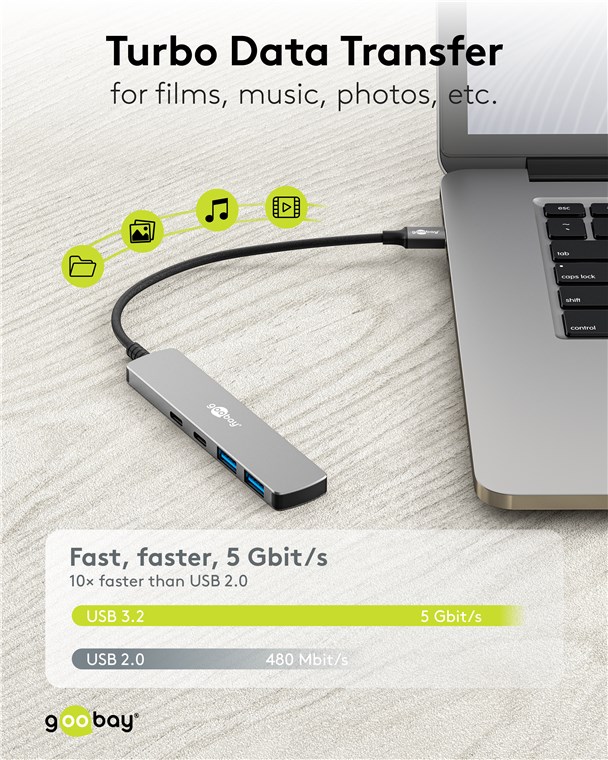 • Über USB 3.2 unterstützt der USB-C™-Adapter SuperSpeed-Datenraten bis zu 5 Gbit/s – perfekt für die Übertragung großer Dateien wie Filme, Videos oder unkomprimierte Audiodateien