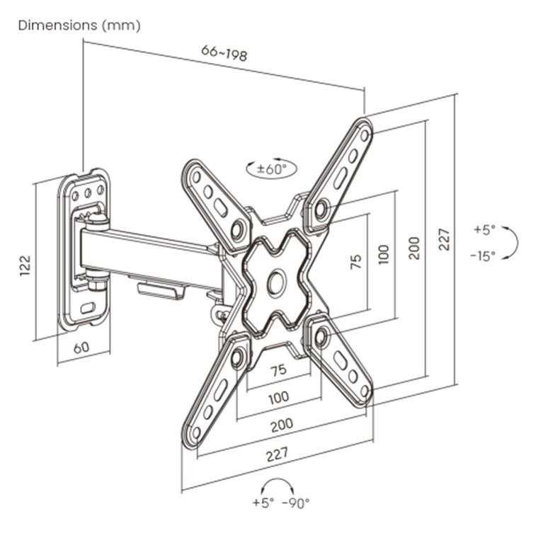 - Flexible TV-Halterung für den optimalen Blickwinkel: +5° bis -15° neigbar (oben/unten), +60/-60° schwenkbar (links/rechts), +5° bis -90° drehbar und 19,8 cm ausziehbar