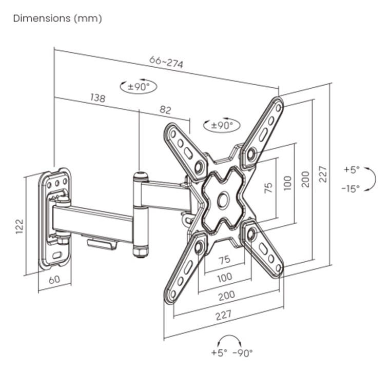 - Flexible TV-Halterung für den optimalen Blickwinkel: +5° bis -15° neigbar (oben/unten), +60/-60° schwenkbar (links/rechts), +5° bis -90° drehbar und 27,4 cm ausziehbar