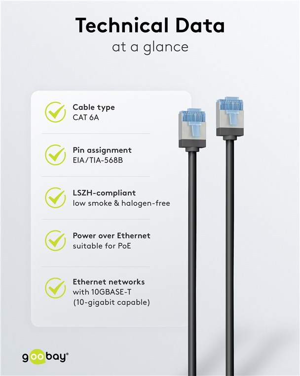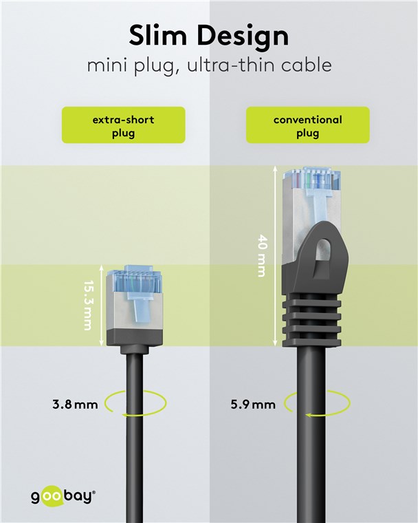 - Superdünnes LAN-Kabel mit extrakurzen RJ45-Steckern für weniger Kabelvolumen im Serverschrank oder Patchpanel und dadurch eine optimierte Luftzirkulation