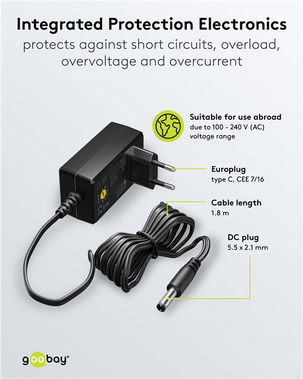 - Sicherungen im Steckernetzteil schützen vor Kurzschluss, Überlastung, Überspannung und Überstrom