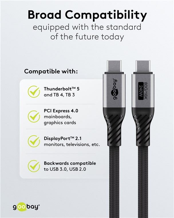 Der Standard der Zukunft schon heute – mit dem schnellsten USB-Kabel aller Zeiten. Mit gigantischen Datenraten von 80 Gbit/s und elektrisierenden 240 W Leistung macht das Kabel selbst dem brandneuen Thunderbolt™ 5 Konkurrenz und wird zum Champion im Gamingbereich. Zukunftsexzellenz für Hochleistungsnotebooks, hochauflösende Multimonitor-Funktionen, leistungsstarke Grafikkarten oder Mainboards wird damit schon heute verfügbar.