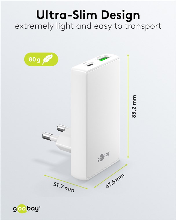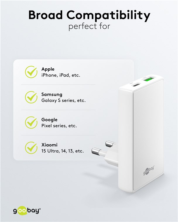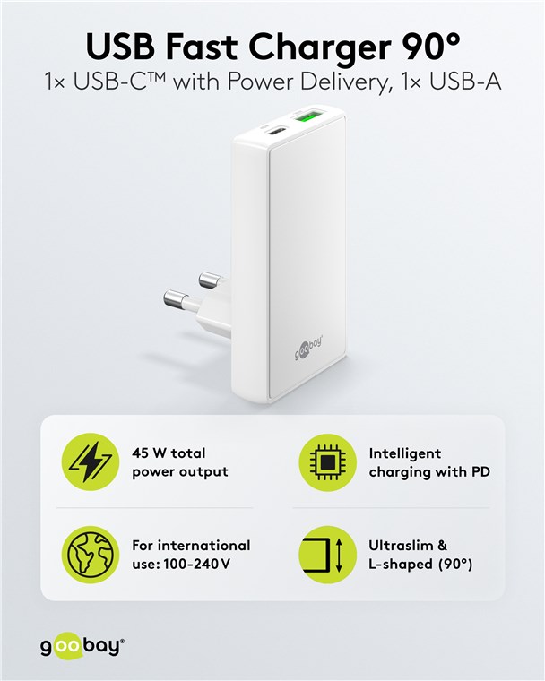 - Mit der starken Leistung von 45 W und dem universellen USB-C™-Anschluss versorgt das Goobay-Netzteil zahlreiche Geräte, vom Smartphone bis hin zu kleinen Notebooks
