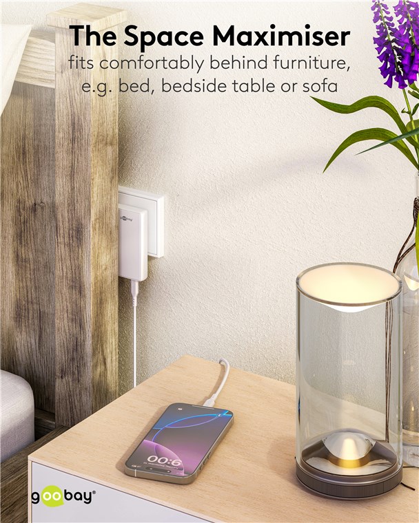 - An die Steckdose angeschlossen ist das USB-C™-Ladegerät kaum tiefer als eine Fußleiste und damit extrem platzsparend – ideal auf beengtem Raum, z. B. hinter Nachttischen und anderen Möbeln