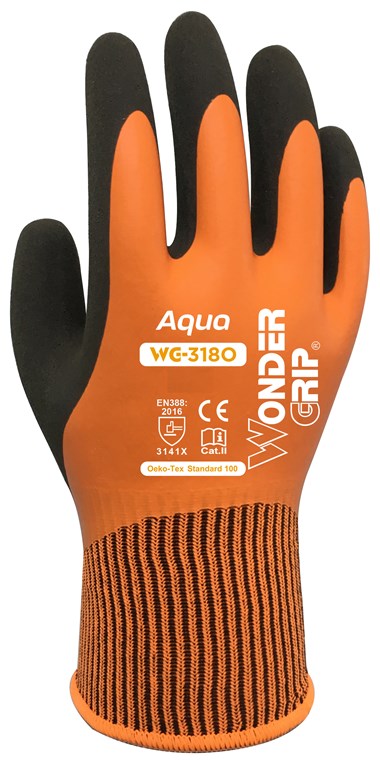 Der WG-318O Aqua ist ein doppelt vollbeschichteter Latexhandschuh mit einem 13-Gauge-Nylonfutter. Dank der Wonder Grip® Technology™ sorgt die Beschichtung für eine unvergleichliche Griffigkeit und Stärke in trockener oder nasser Umgebung. Der WG-318O Aqua ist 100 % wasserdicht und hält die Hände des Benutzers trocken und komfortabel. In Bezug auf Griffigkeit und Flexibilität ist er unser bevorzugter Handschuh für nasse Umgebungen.