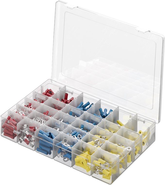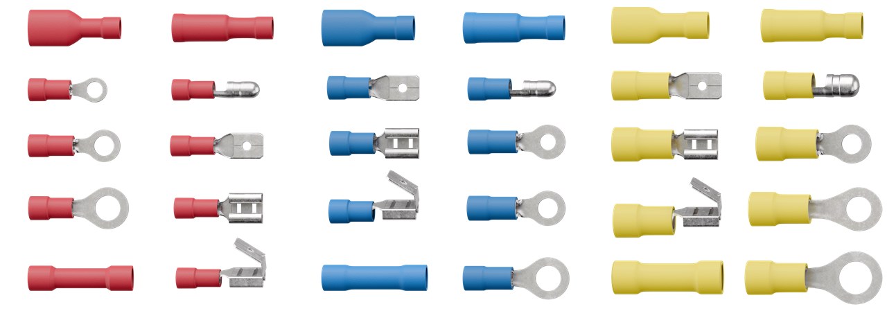 - Yellow for AWG 12–10, 4–6 mm²: Spade connectors 10x fully insulated (F), 10x partially insulated (F), 10x partially insulated (M), bullet connectors 10x F, 10x M, butt connectors 10x, piggyback spade sockets 10x, ring cable lugs M4, M5, M8, 10x each