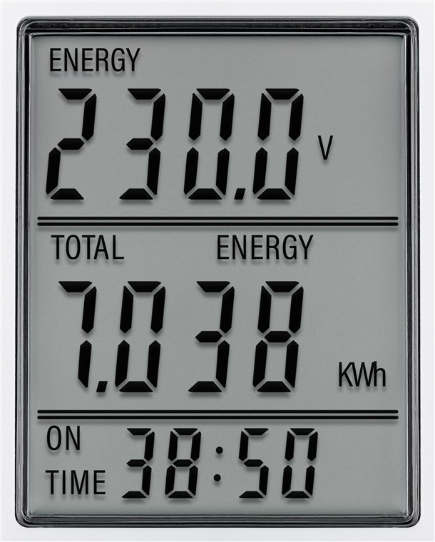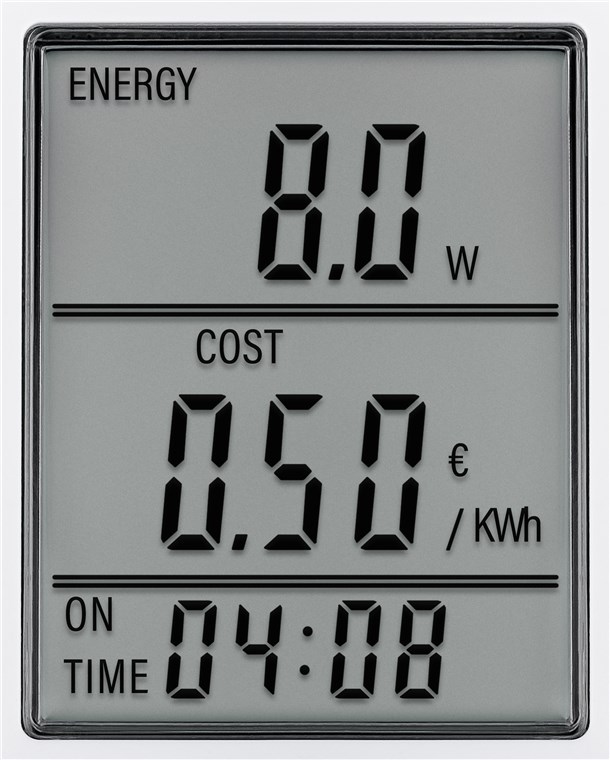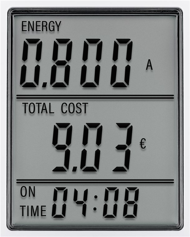 - Energy meter with an easy-to-read, three-line LC display that simultaneously shows the energy consumption, energy costs and the consumption time