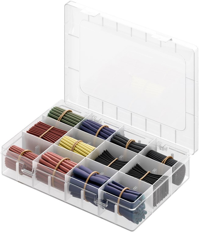 - The heat-shrink tubing assortment is supplied in a neatly organised plastic box with a practical hanging tab and a printed overview on the inside of the lid