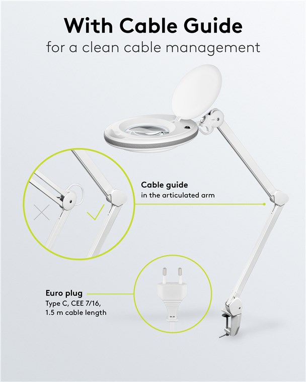 - Articulated arm of the hands-free magnifier with light with integrated cable guide ensures a flexible 700 mm working radius.