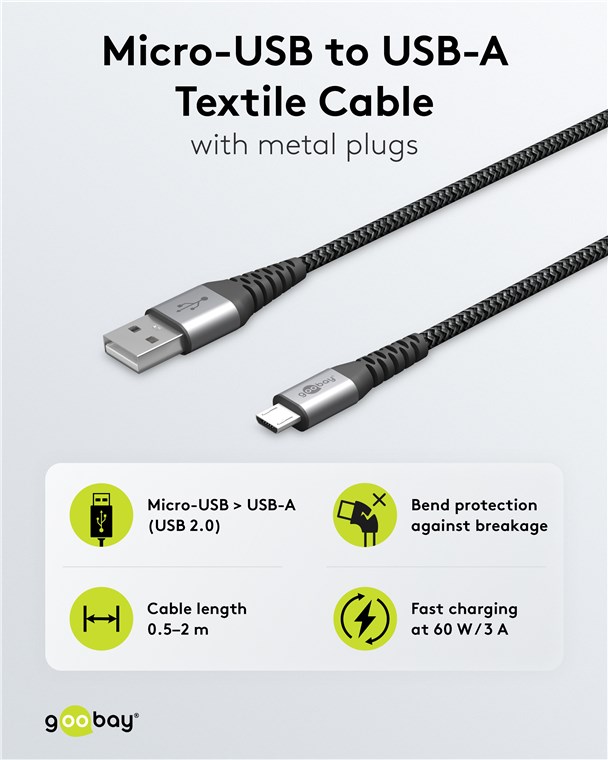 - The Micro-USB to USB-A cable is extremely hard-wearing and durable thanks to the reinforced metal plug and textile coating.