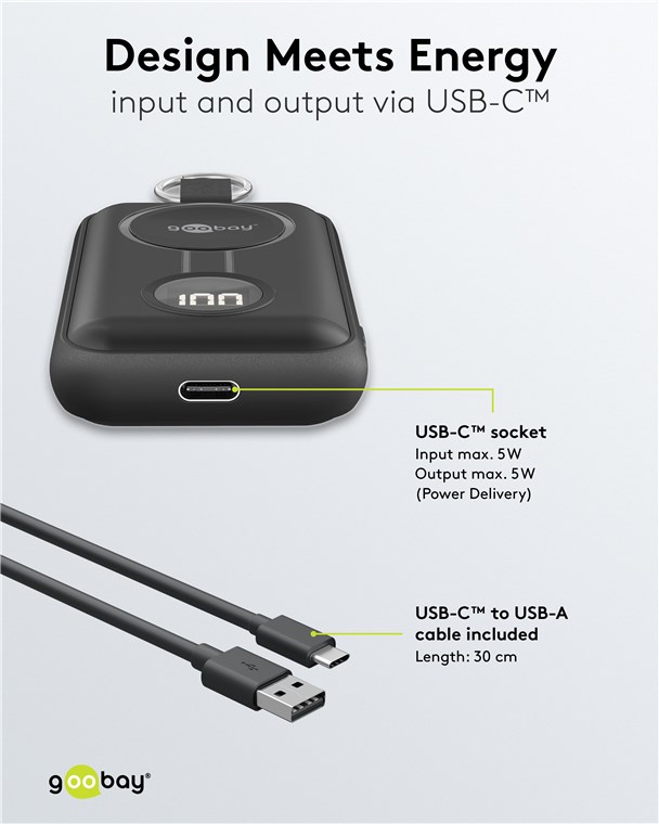 - The power bank is recharged via the combined USB-Câ„¢ input/output (USB-Câ„¢ to USB-A charging cable included, 0.3 m)