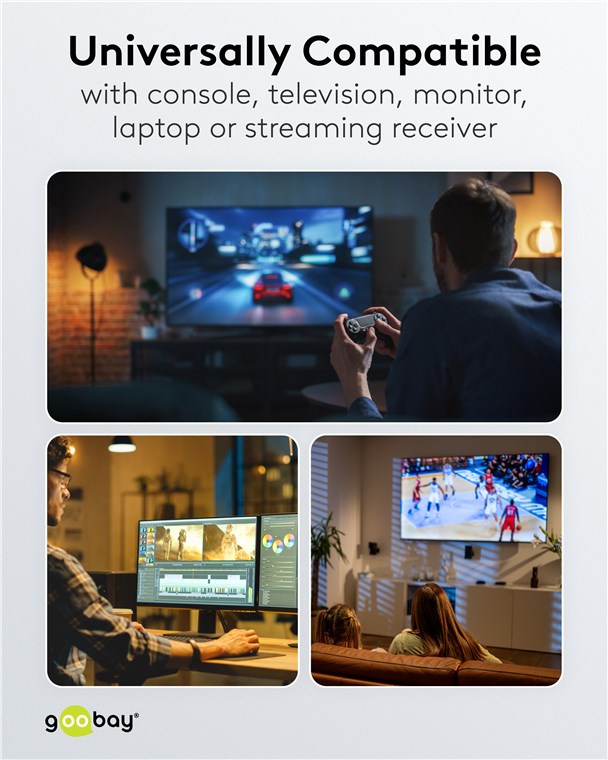 - Divertissement haut de gamme : Idéal pour la transmission audio-vidéo, p. ex. depuis des consoles de jeux (PlayStation 5, Xbox), des services de streaming et des récepteurs (Amazon Fire TV, Apple TV) vers un téléviseur, moniteur ou projecteur