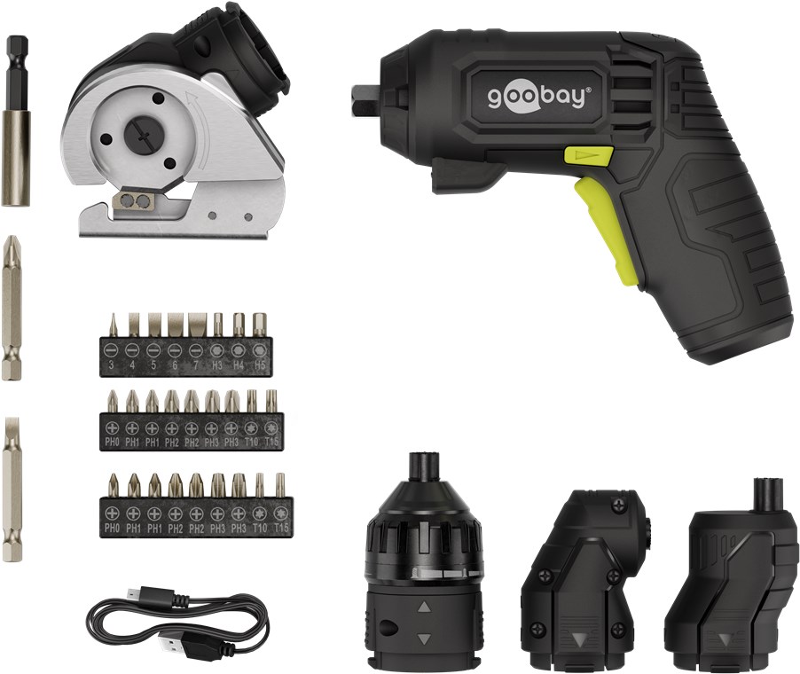 - 4 embouts flexibles pour les endroits difficiles d'accès : 1x embout coudé à 90°, 1x embout excentrique (porte-embout décalé pour les angles), 1x embout avec 5 niveaux de couple, 1x embout universel avec lame