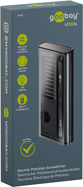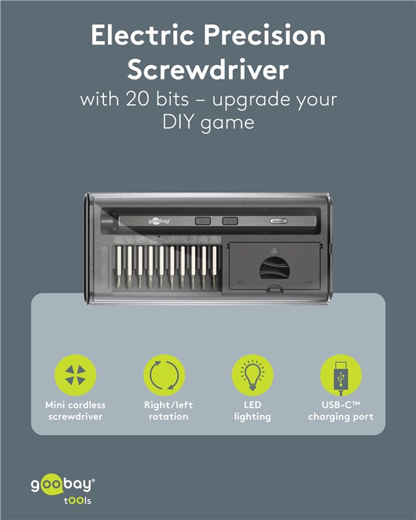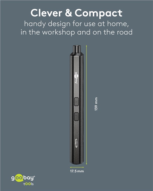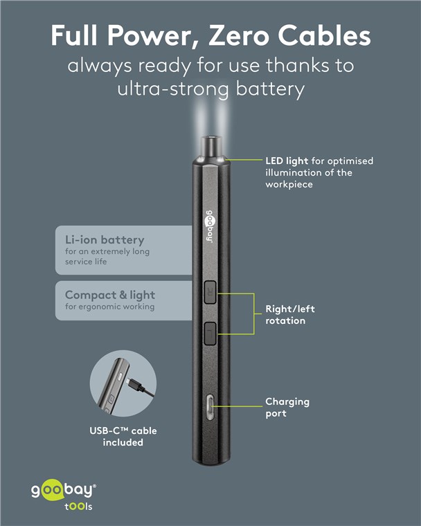 • Tournevis avec connecteur USB-C™ pour le chargement, câble de chargement inclus 39 cm (USB-C™ vers USB-A)