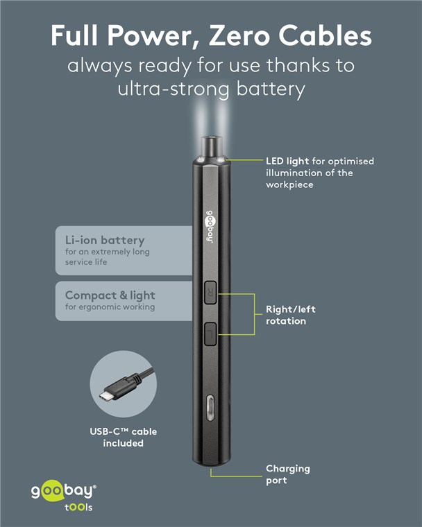 - Tournevis avec connecteur USB-C™ pour le chargement, câble de chargement inclus 39 cm (USB-C™ vers USB-A)