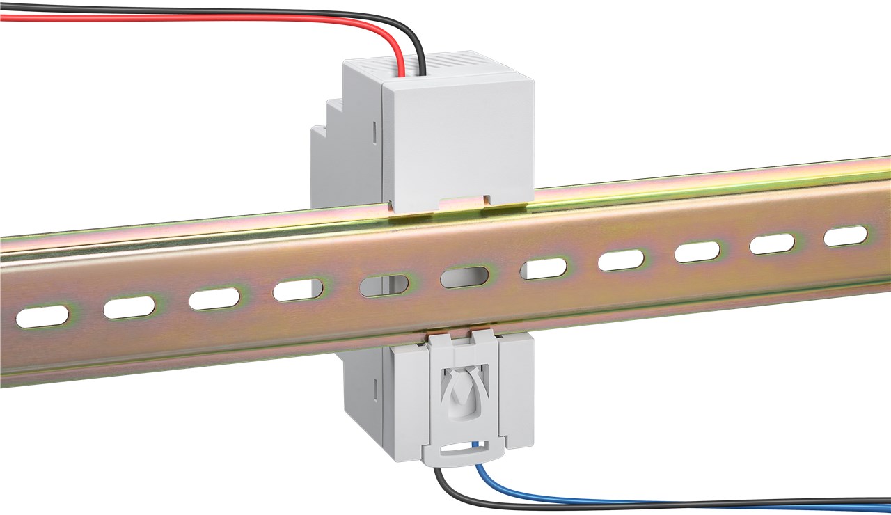 - Mit 35,2 mm Breite besonders kompakt und mittels Klicksystem schnell und einfach auf einer DIN-Schiene mit Hutprofil montierbar, z. B. im Schaltschrank