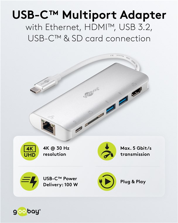 4K @ 60 Hz, PD 100 W, espande una porta USB-C™ con 1x Ethernet, 1x HDMI™, 1x USB-C™ (PD), 2x USB-A (USB 3.2) e 1x slot per schede SD
