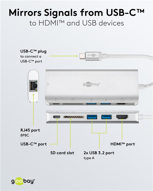 Adattatore multiporta USB-C™ a HDMI™, USB-A, lettore di schede, RJ45, alluminio, argento
