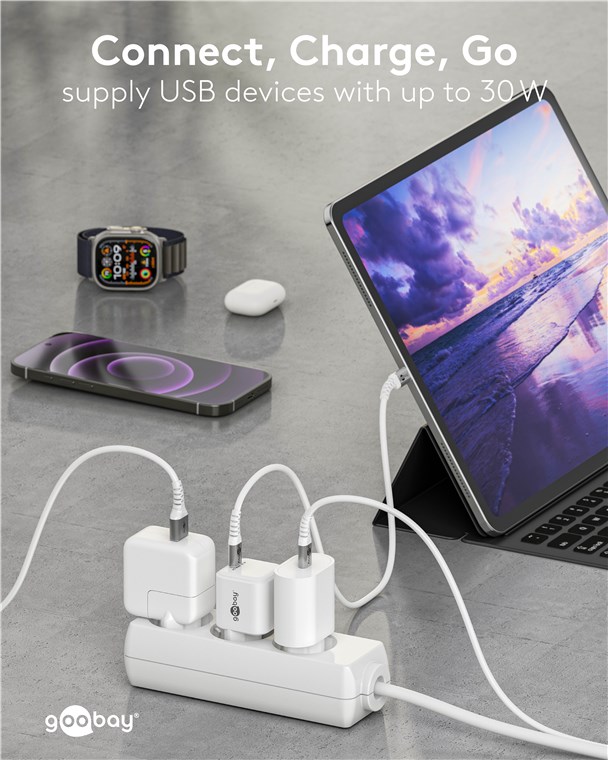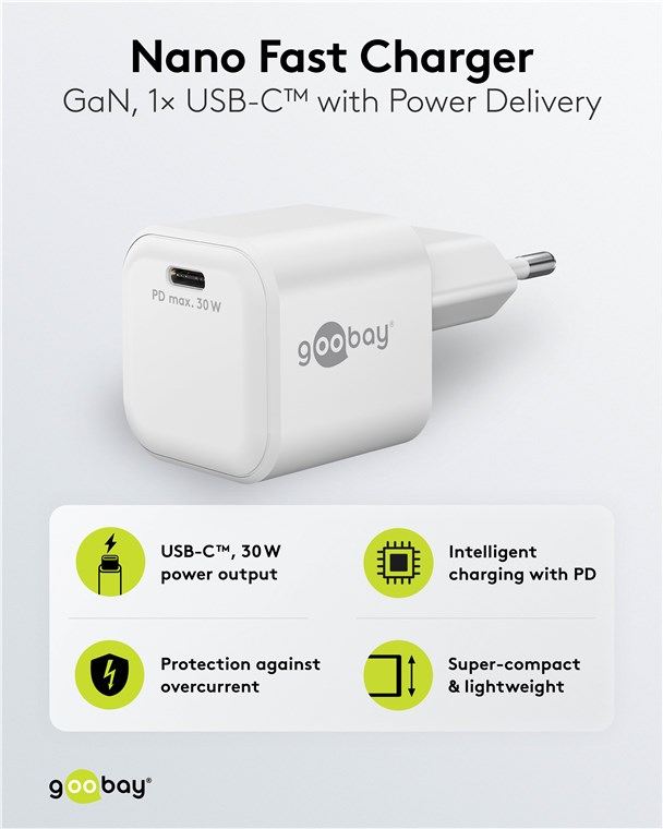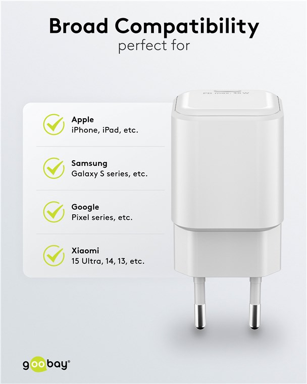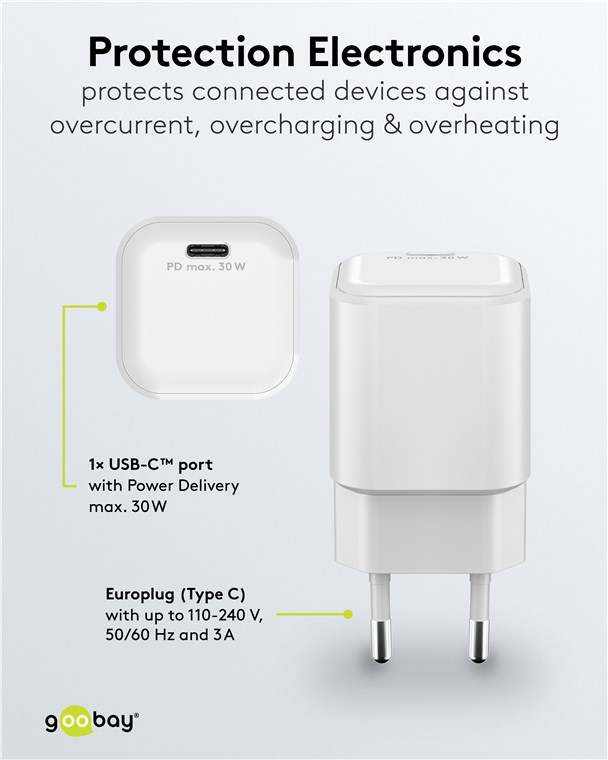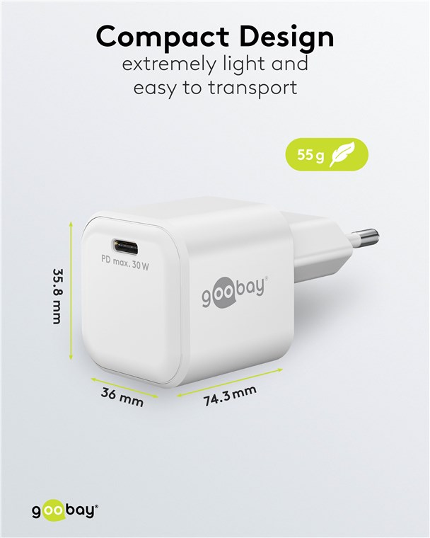 - Con una potenza di 30 W, l'adattatore di ricarica è particolarmente adatto a dispositivi piccoli come smartphone, cuffie Bluetooth, tablet o power bank