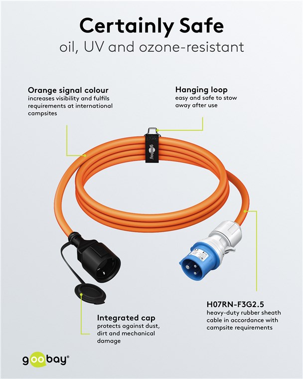 - Il colore arancione del cavo di alimentazione garantisce una maggiore visibilità ed è conforme agli standard di sicurezza dei campeggi internazionali