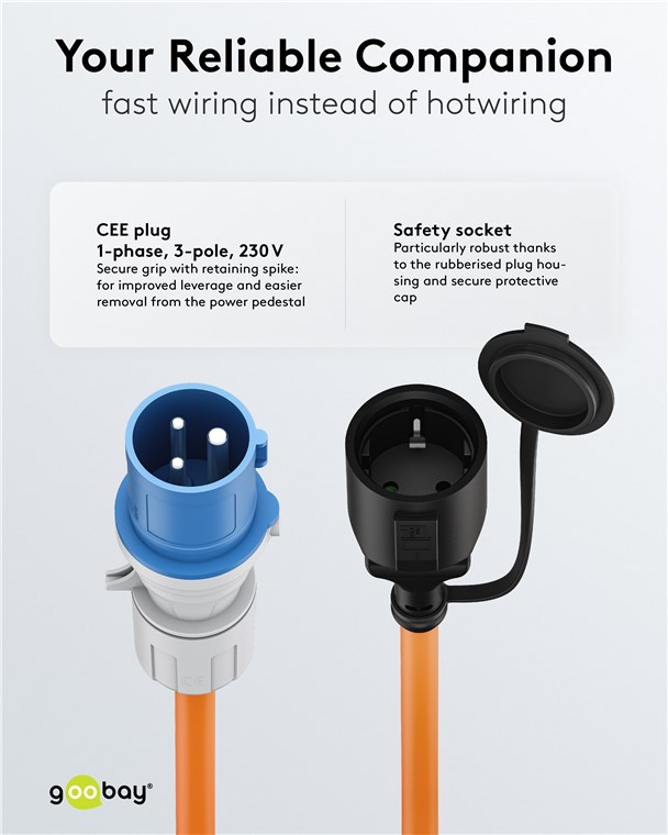 Il must per il campeggio e l'uso all'aperto: Il cavo CEE è il garante affidabile dell'alimentazione per tutte le funzioni elettriche in camper, caravan o anche in cantiere. Collegato in modo sicuro alla rete elettrica a 230 V del campeggio, ogni escursione all'aperto diventa un'esperienza energetica rilassante. Piena potenza, piena convenienza.