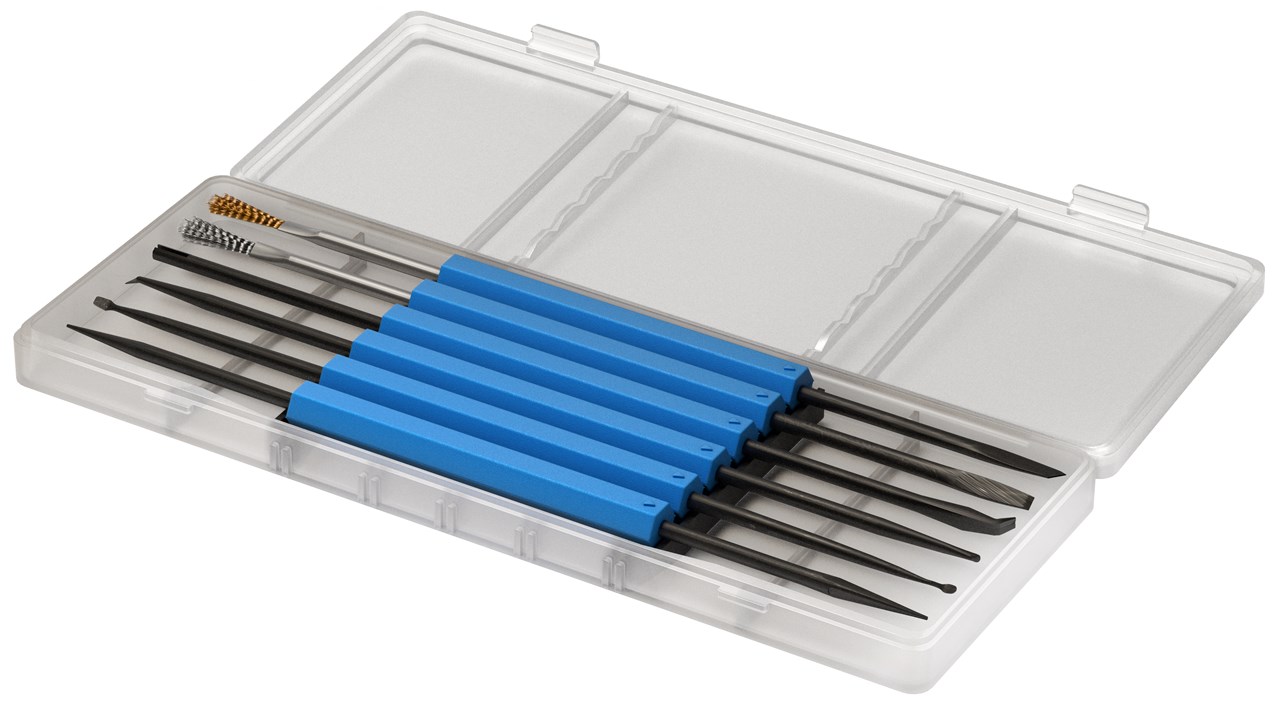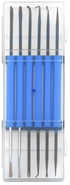 - 2x portachip, 1x alesatore con sezione circolare per la pulizia dei fori delle schede, 1x leva e 1x gancio per estrarre parti delle schede, 2x raschietti appuntiti per rimuovere la corrosione