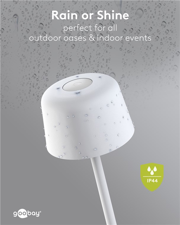 - Dzięki ochronie przed bryzgami wody (stopień ochrony IP44), lampa stołowa jest również idealna na patio, balkon lub do ogrodu